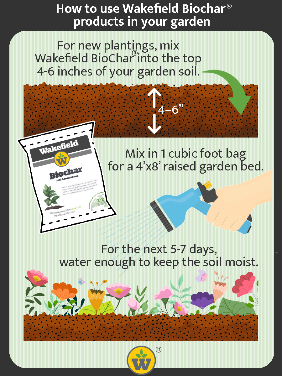 How to use Biochar in Your Garden Whether your garden is a source of nourishment, beauty, or both, you want it to thrive. Using biochar as a soil amendment can make the plants in your garden flourish as never before. Using premium biochar for gardening improves any type of soil, which leads to increased fertility and healthier plants. It also means less work for you! What Is Biochar? At this point, you are surely asking, “What is biochar and why is it such a vital addition to the soil?” Biochar is created by heating biomass, or organic matter, at high temperatures in an oxygen-free environment. This process, called pyrolysis, is the modern version of how Amazonian natives made Terra Preta. Indigenous people of the Amazon infused the poor soils of the jungle by creating this rich black high-carbon material. Researchers believe that after cutting plant material, it was burned and then buried to smolder. The end result was mixed with compost to make the incredibly fertile Terra Preta. Centuries later, these soils remain exceptionally productive. Virtually any type of biomass can be turned into biochar. However, biochar made from wood is widely used because of its high porosity and excellent quality. How Does Biochar Benefit Gardens? Successful gardening requires healthy soil. Here are just some of the ways biochar improves soil health for gardens: Increased growth Biochar increases soil fertility, which increases plant growth and yield. Because biochar aids in water retention, plants can flourish even in times of drought. Increased pest and disease resistance Biochar boosts your plant’s immune system, helping them to combat disease. It can suppress plant pathogens and adsorb toxins produced by these pathogens. Adsorb differs from absorption in that the latter refers to particles transferring to another material while the former involves particles adhering to a substance. Increased nutrient retention Because biochar increases the soil’s ability to retain water and nutrients. Plants can more easily access these nutrients, including calcium, magnesium, and phosphorous, through their roots. After adding biochar to the soil, your garden will need less watering. Biochar keeps nutrients in the soil rather than have them leach into groundwater. Biochar does not contain nutrients per se. It serves as a conduit to make nutrients readily available to plants. Improved soil structure Biochar improves soil structure in various ways, including: Increasing the ability to hold moisture Reducing soil compaction and density Improving water drainage Improving aeration Beneficial microbes Healthy soil is home to billions of beneficial microorganisms. Ranging from bacteria to fungi to earthworms, these microorganisms aerate soil, bring water to plant roots, and their waste becomes plant nutrients. Biochar’s porosity allows it to hold the proteins and other nutrients produced by microbes. Your soil will team with beneficial bacteria and fungi. Carbon sequestration Climate change threatens our planet. Carbon dioxide stands out among the greenhouse gases driving global warming, which is responsible for a changing climate. Biochar sequesters carbon in the earth, keeping it out of the atmosphere. Roughly 2 pounds of carbon dioxide are sequestered for every pound of biochar used. How to Use Biochar for Growing Gardens By using compost and biochar for gardening, you are supercharging your soil. Over time, you will not need to use as much fertilizer to achieve a vibrant, gorgeous garden. How to use biochar in a vegetable garden If your garden soil is not of the best quality, biochar can make a huge difference in the condition and output of your vegetable garden. Mix biochar into your vegetable garden in late winter or early spring. After using biochar in your vegetable garden, you should find your yield increasing even as your vegetables grow larger. How much biochar to use How much biochar to use depends not only on the size of your garden but also on the quality of its soil. If you are blessed with good soil, use between 3 to 4 cubic feet of biochar for every 100 square feet. If your soils are poor, consisting mostly of sand or clay, up the amount of biochar to 5 or 6 cubic feet per 100 square feet. When planting in a typical 4 x 8 foot raised garden bed, use a 1 cubic foot bag of biochar. In your biochar applications, there is no need to use more than the recommended amount. Adding more biochar than you need does not further improve the soil. When to apply biochar While you can apply biochar at any time, your garden benefits most when biochar is applied in the early spring. Keep in mind that biochar stays in the soil for a very long time. It’s basically there for good. How to apply biochar For new plantings, mix biochar into the top 4 to 6 inches of your garden soil. For most gardens, you can simply top-dress biochar on top of the soil. Tilling is the standard way to mix biochar into the soil for larger areas, but hand planting is fine for smaller plots. For the next five to seven days, water sufficiently to keep the soil moist. Learn More From Wakefield Biochar Wakefield BioChar is the leader in biochar soil conditioners. We are also a family-owned company with a mission, summed up as Better Soils, Better World. We are committed not only to environmental sustainability but to helping gardeners grow healthier, more productive, and beautiful plants with less